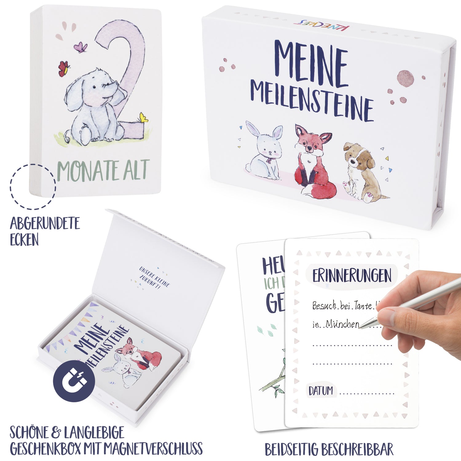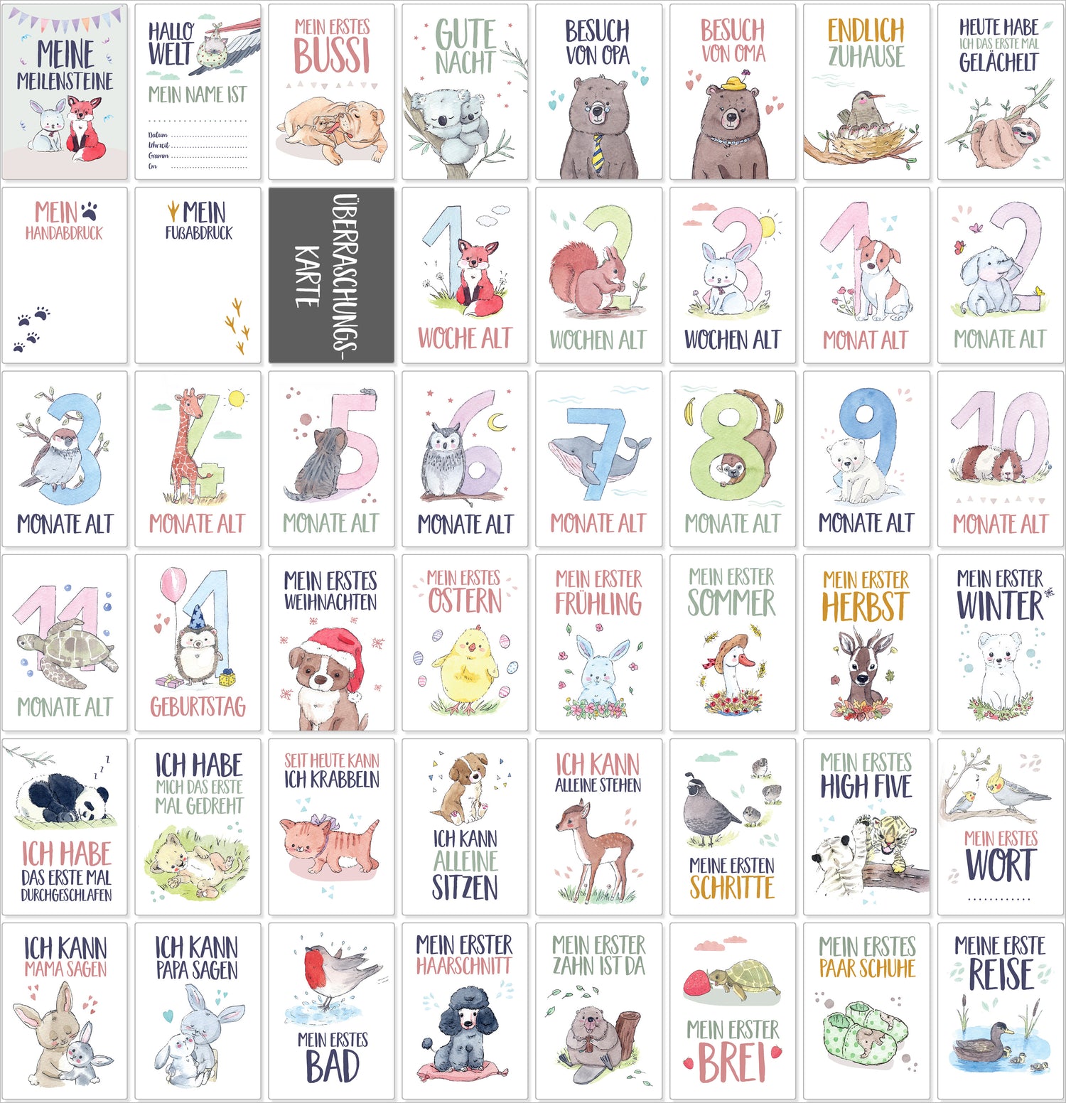 - KARTENBESCHREIBUNG – Die süßen unterschiedlichen Tiermotive auf den Ereigniskarten passen für Jungen und Mädchen gleichermaßen, auf der Rückseite lassen sich Anmerkungen zu den Momenten notieren.