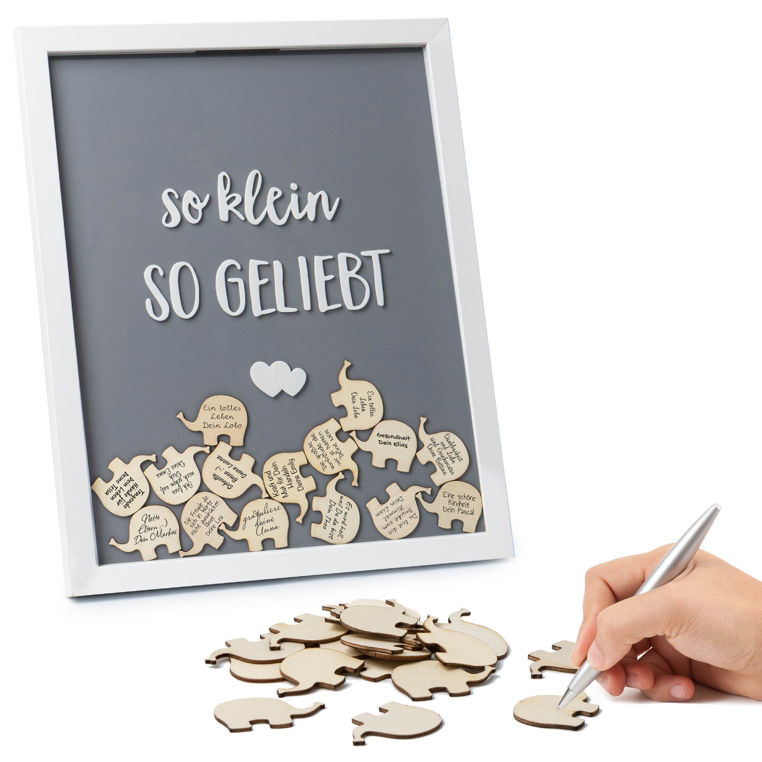 - ANWENDUNG – Für Babyparty, Babyshower, Pullerparty oder Taufe | Einfach die kleinen Elefanten mit Sprüchen oder Wünschen durch die Gäste ausfüllen lassen, Oben durch den Schlitz in den Rahmen werfen