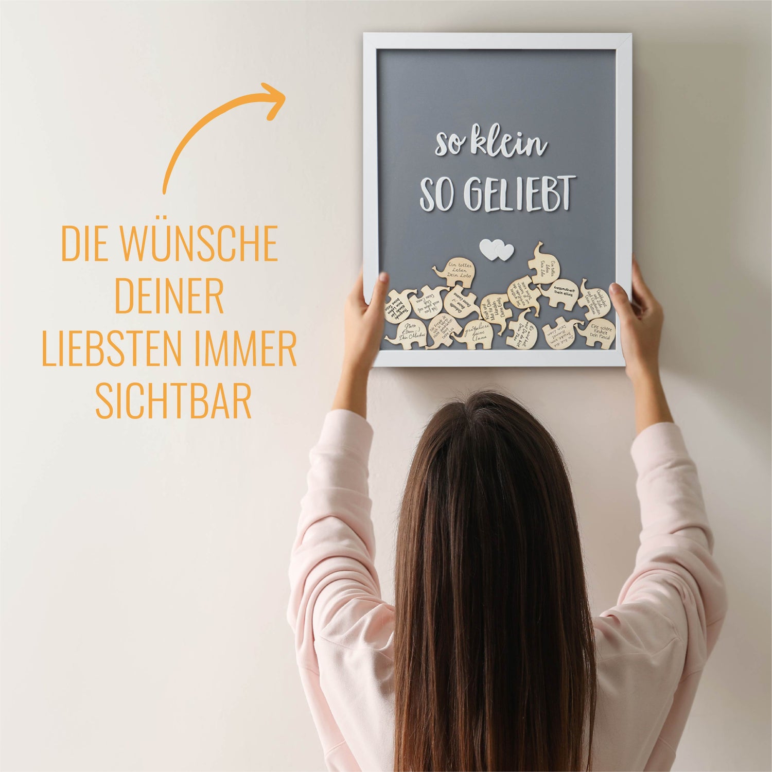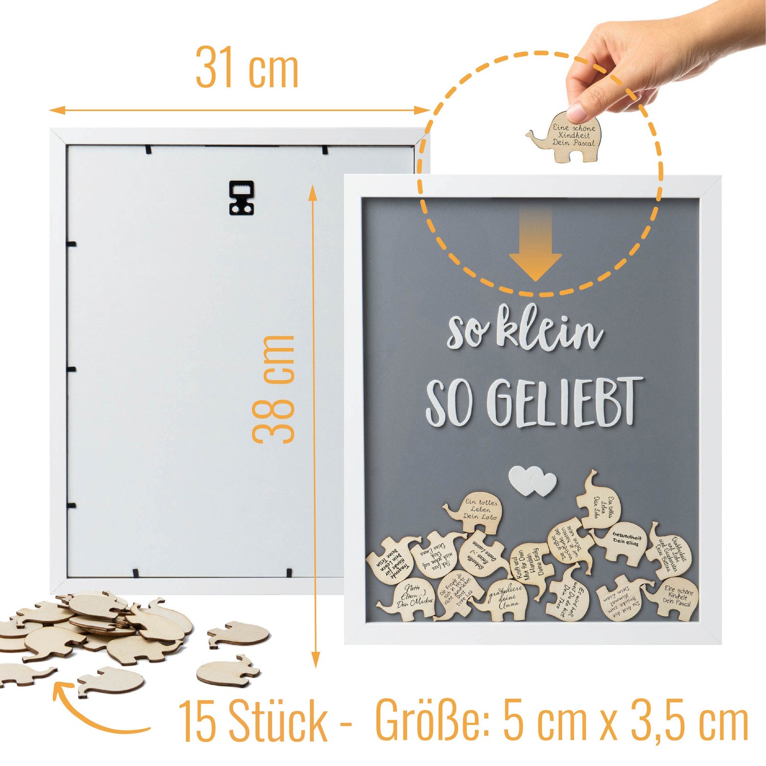 - LIEFERUMFANG – ✅ Wünsche Rahmen Set (Neutral für Junge und Mädchen / mit Abnehmbarer Rückseite) ✅ 15 kleine Holz-Elefanten zum beschriften ✅ Jede Menge Spaß und ein tolles Andenken